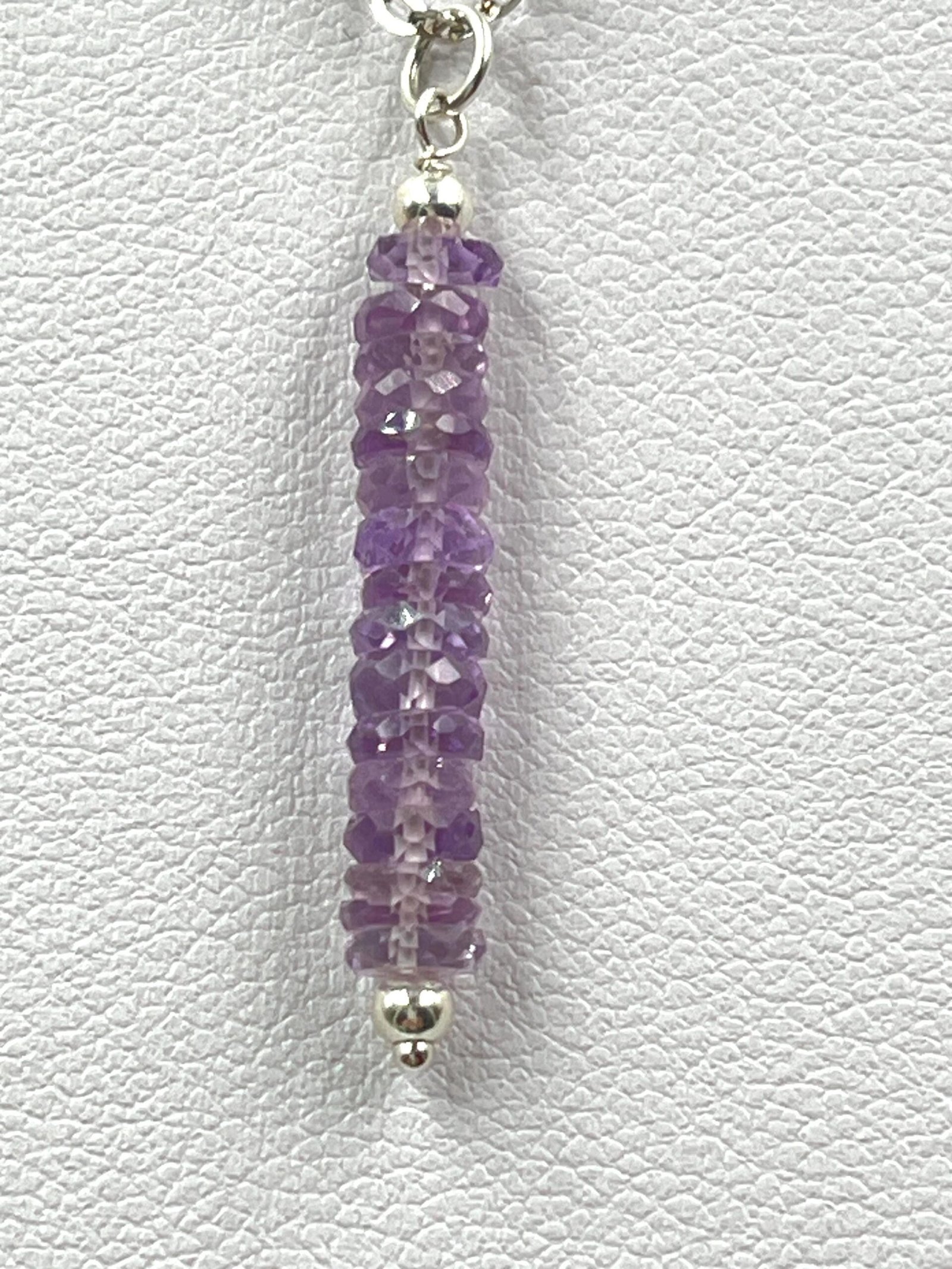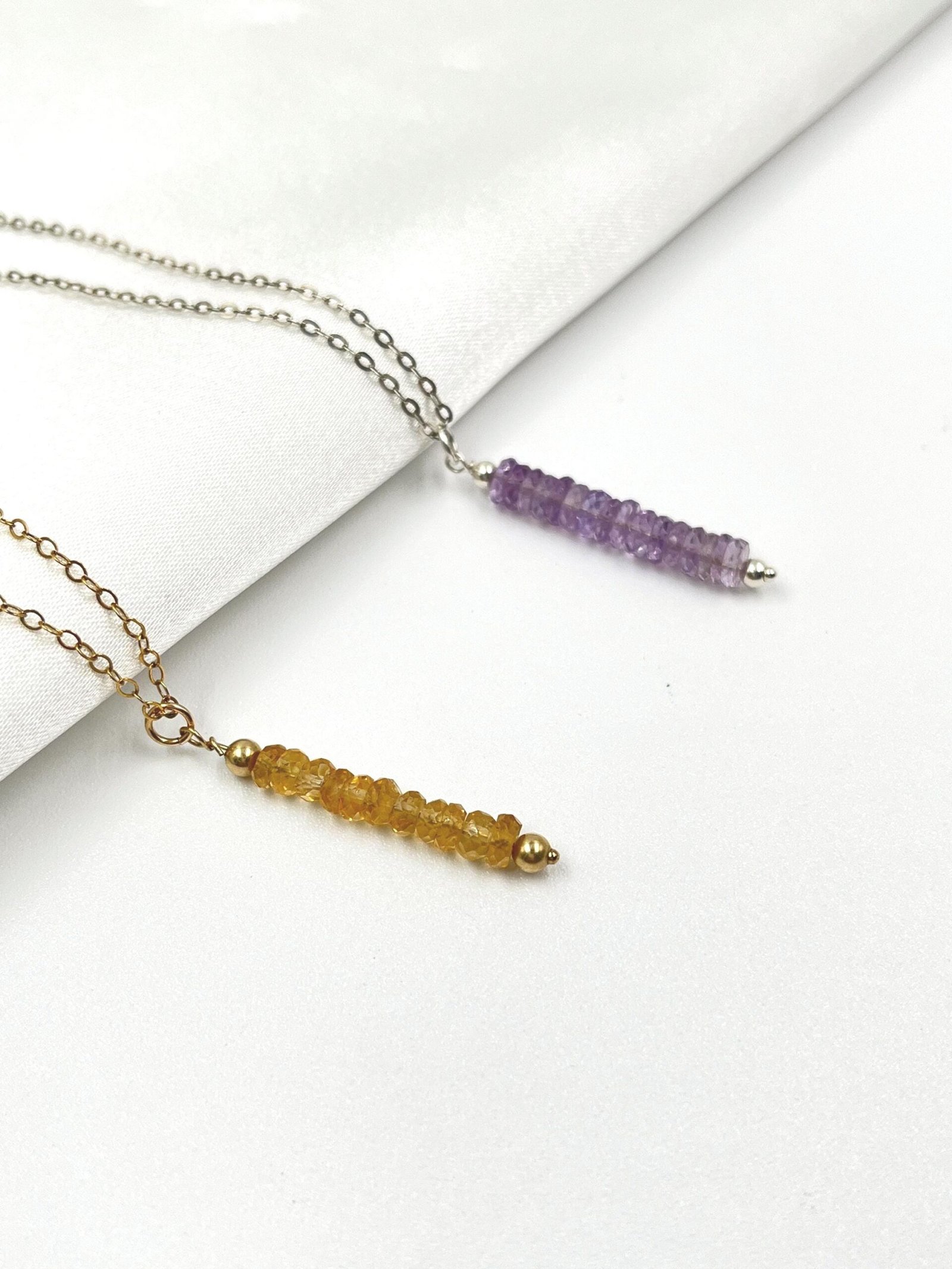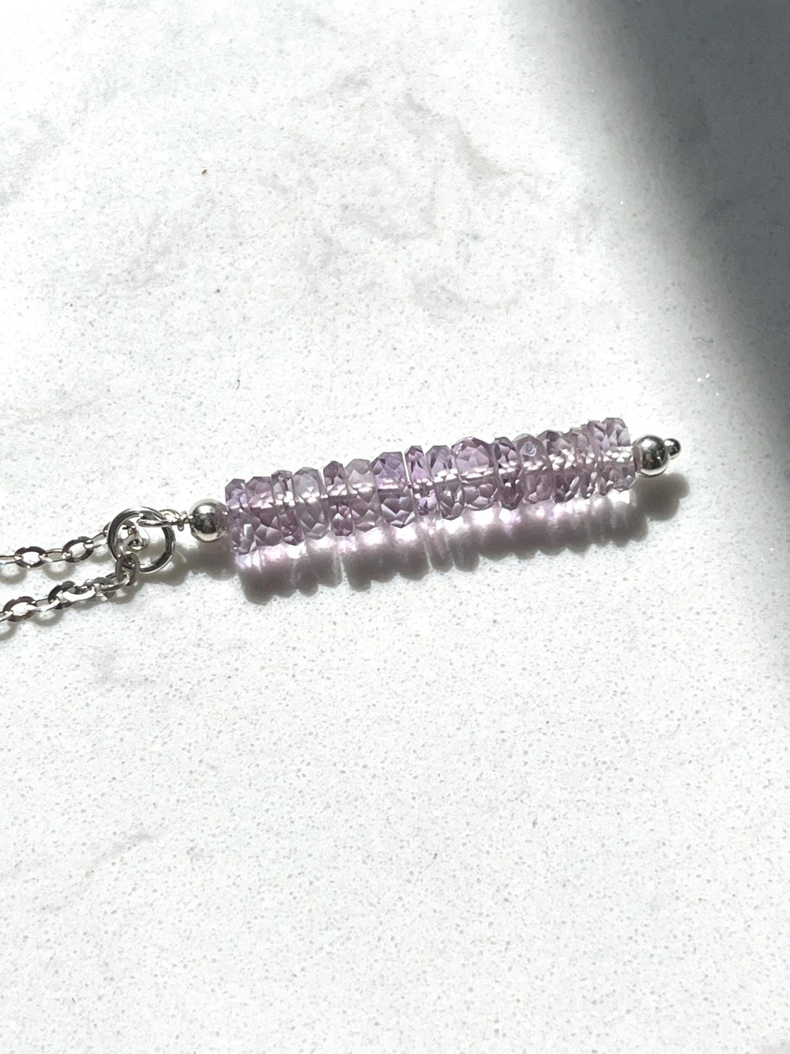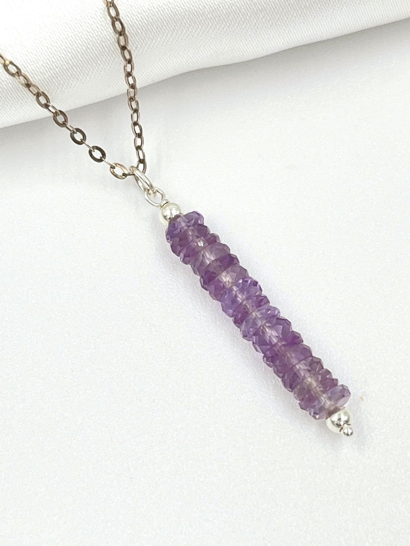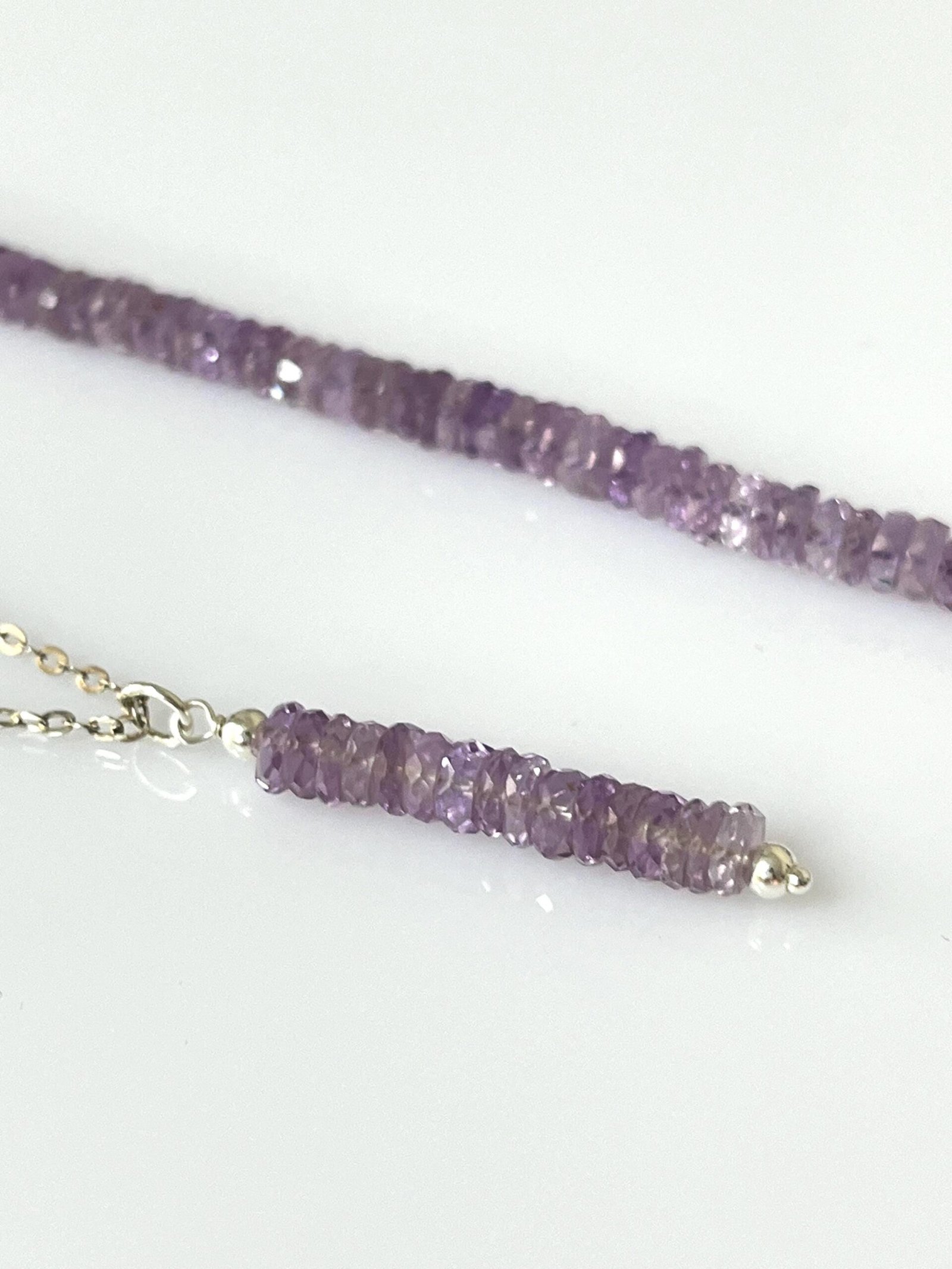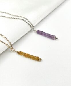 This handcrafted Amethyst bar necklace blends minimalist design with a soft purple tone. Made in your choice of Gold Filled or Sterling Silver, it features faceted Amethyst beads arranged in a sleek, modern bar shape. Lightweight, refined, and perfect for everyday wear.