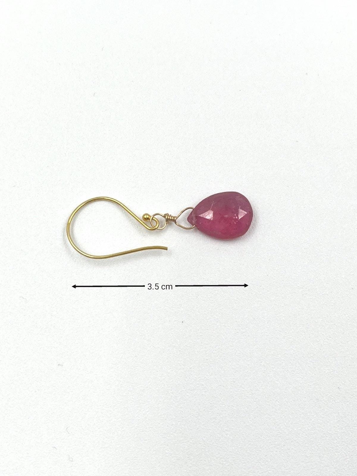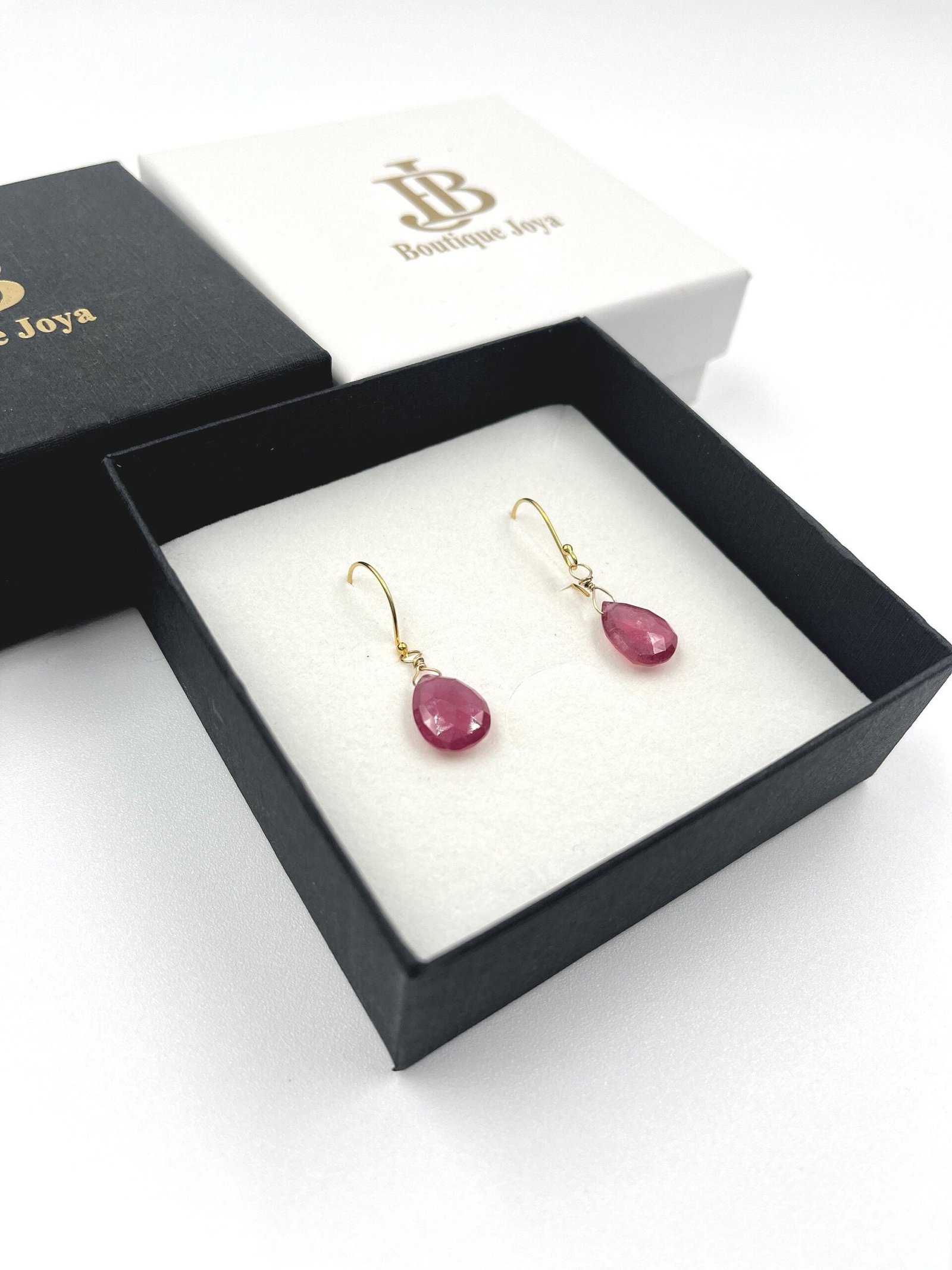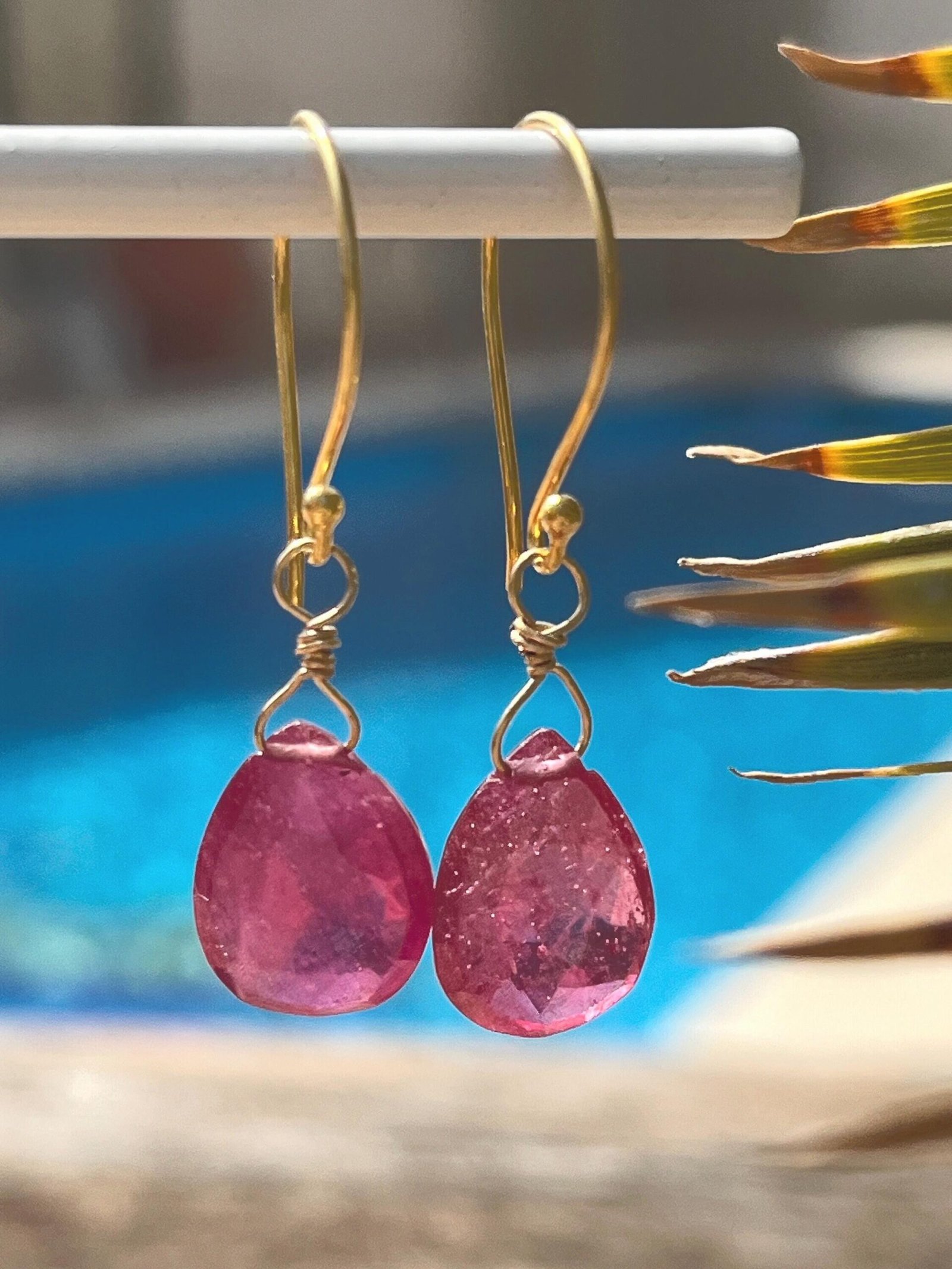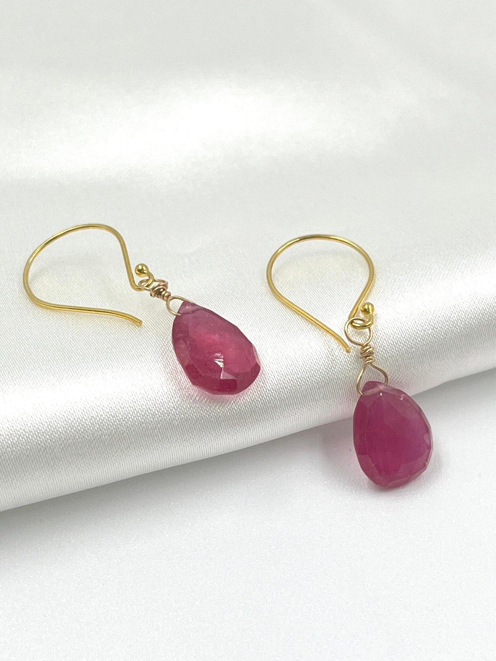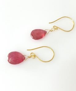 These Garnet drop earrings feature natural gemstones with a deep, rich red tone. Hand‑wrapped with 24K gold plated ear wires, they offer a lightweight, refined look suitable for everyday wear.