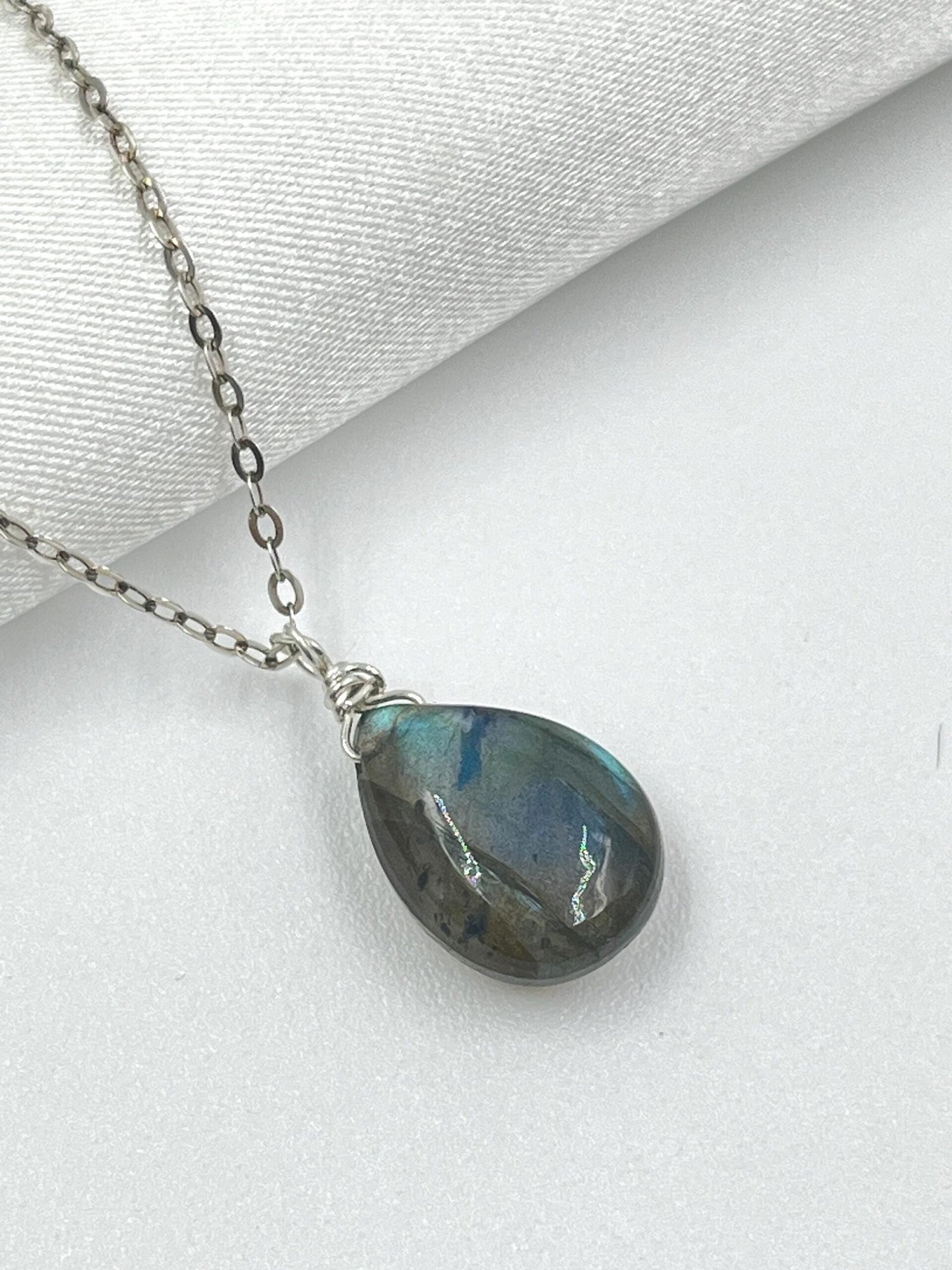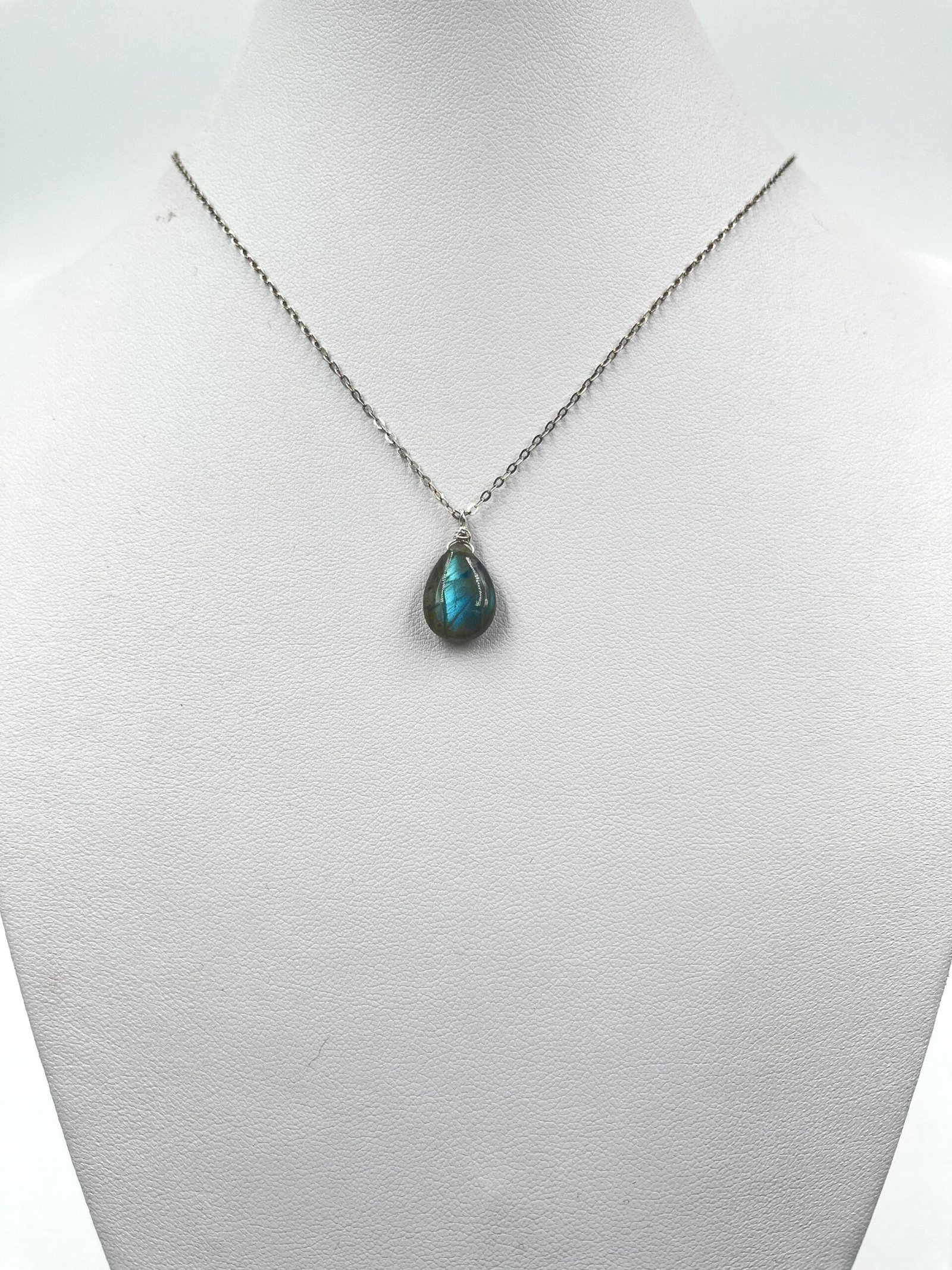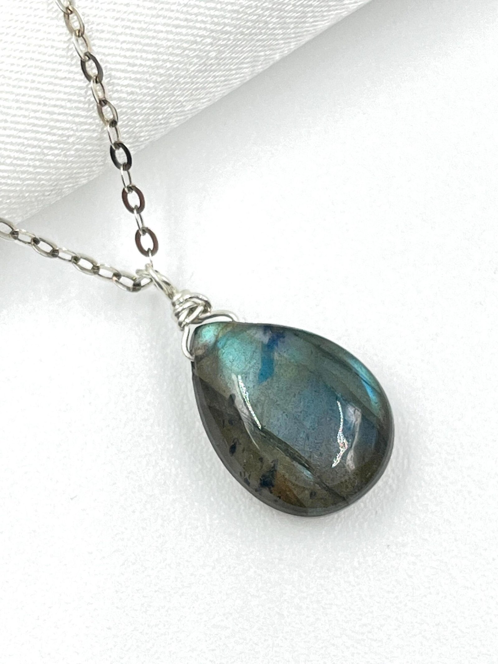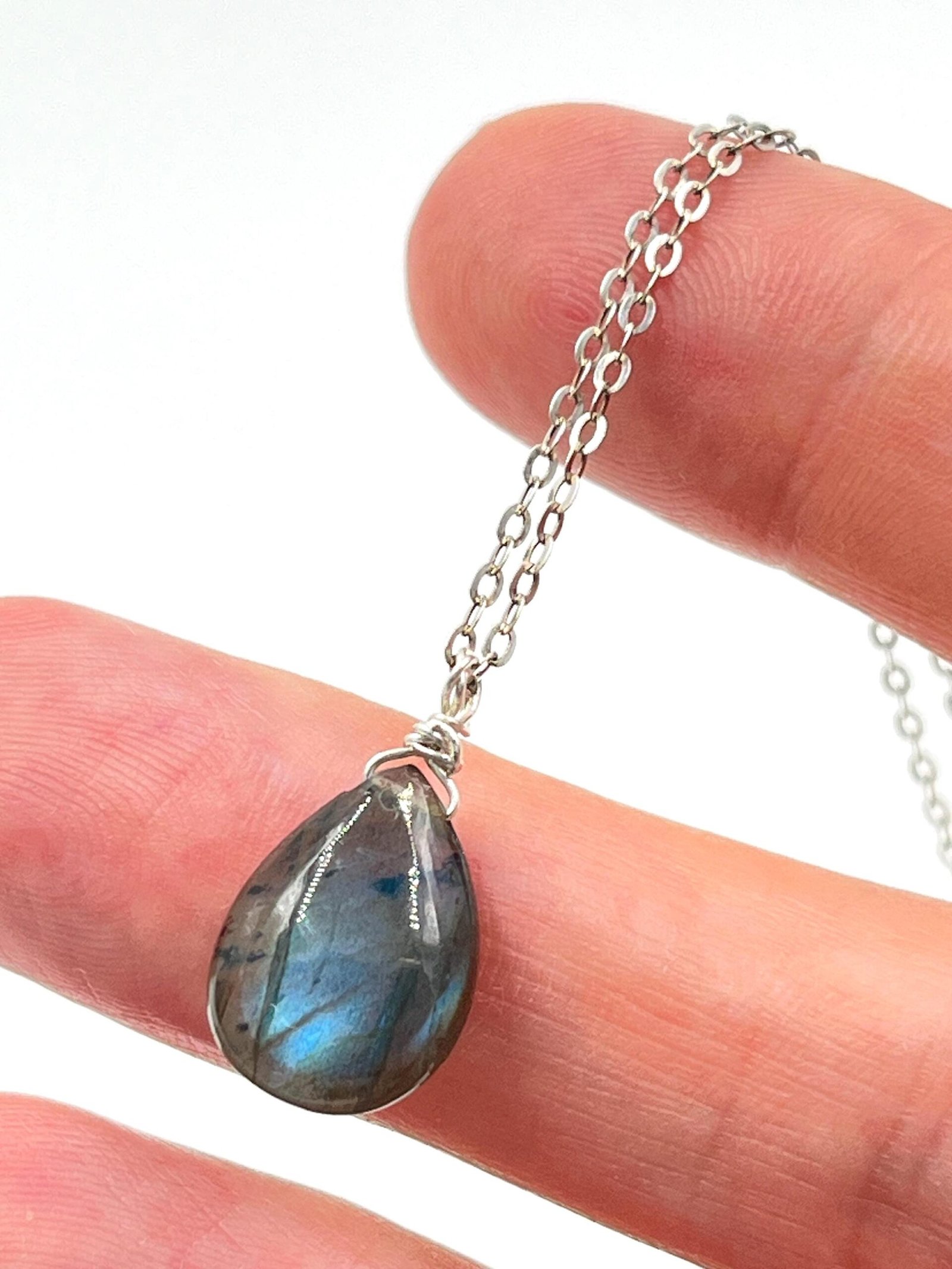 This Labradorite pendant necklace features a natural gemstone with flashes of blue, green, and gold — a visual effect known as labradorescence. Handcrafted in your choice of 14K Gold Filled or Sterling Silver, it adds a subtle, colorful glow to your everyday style.