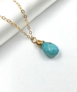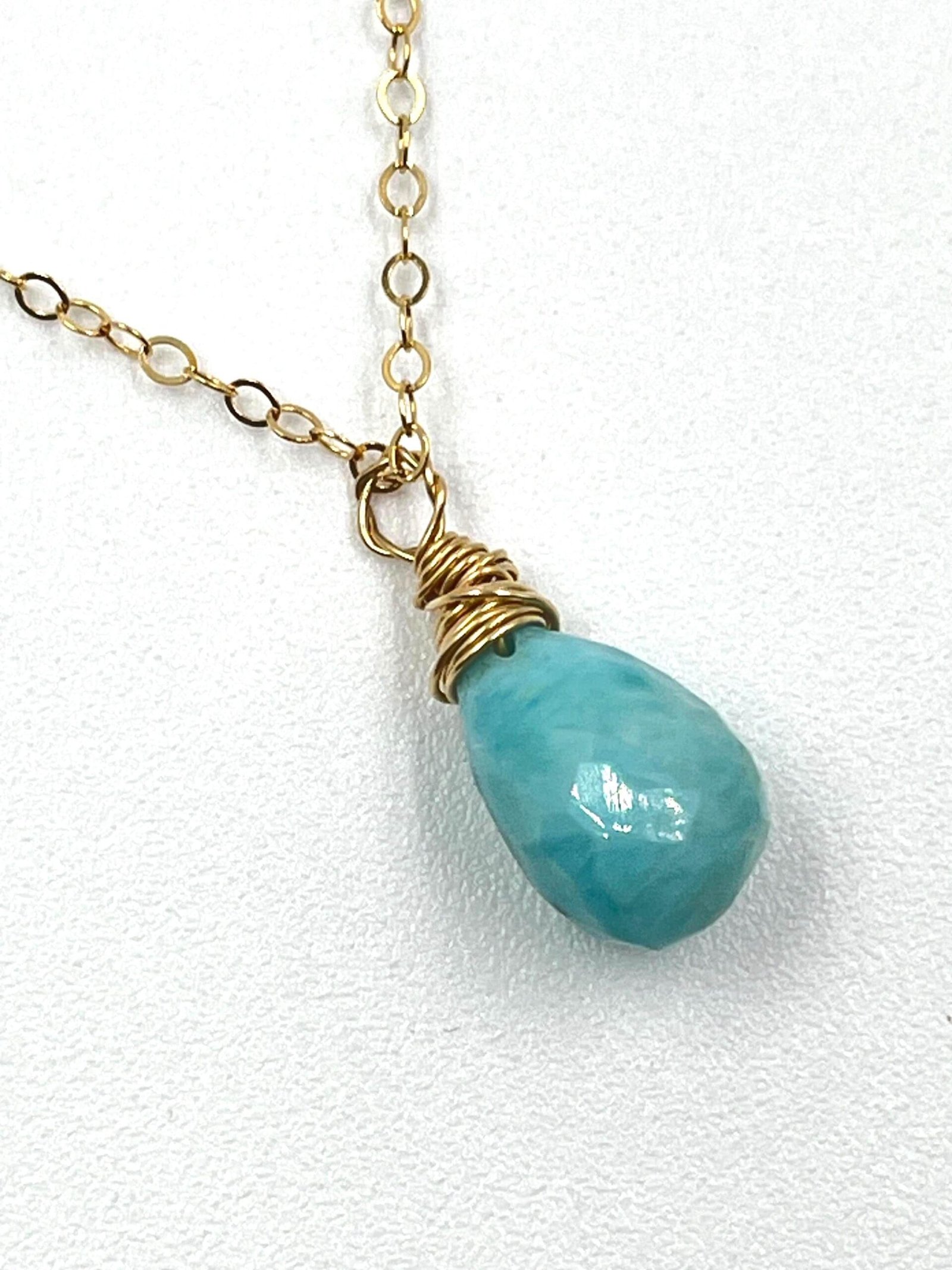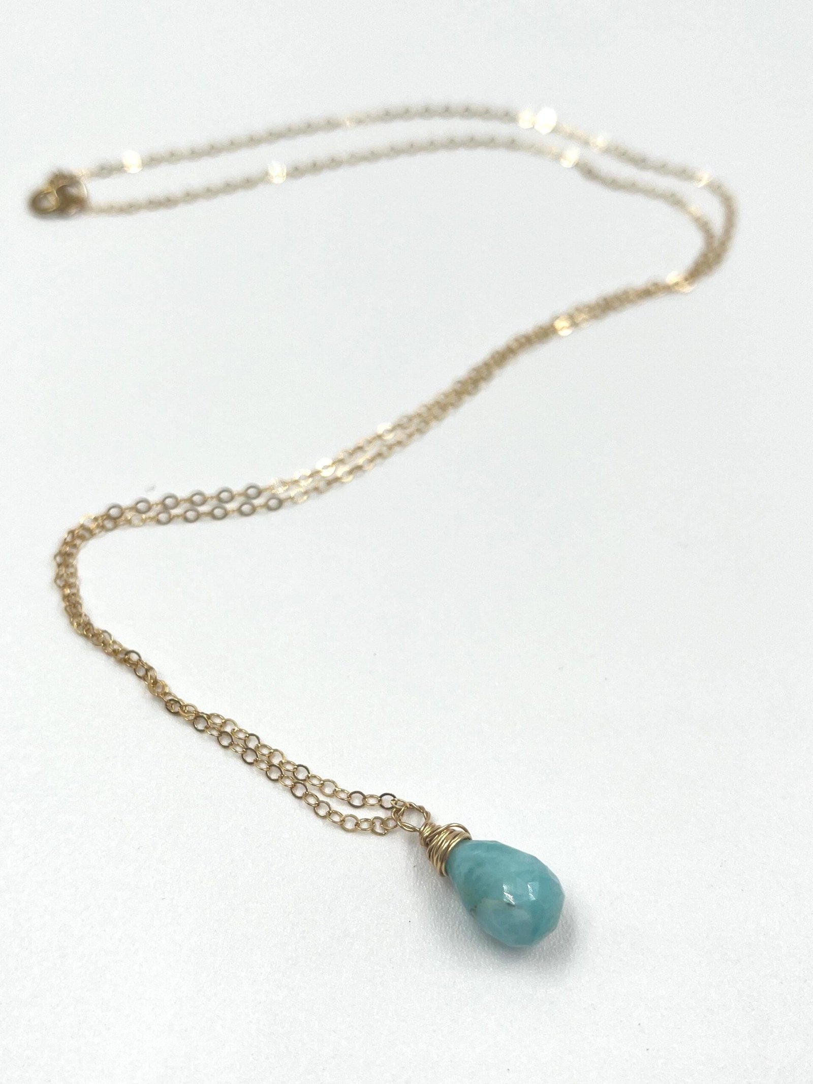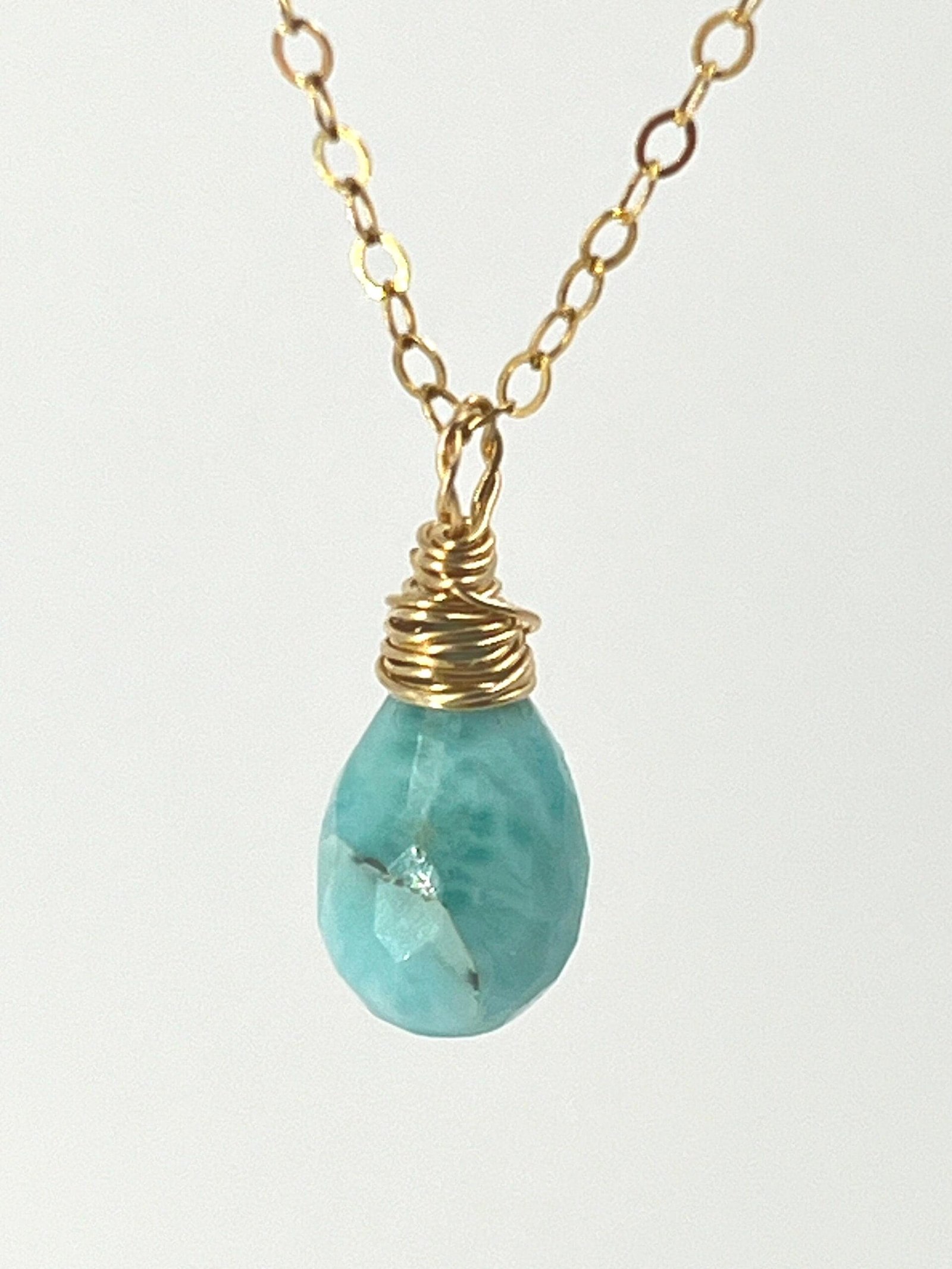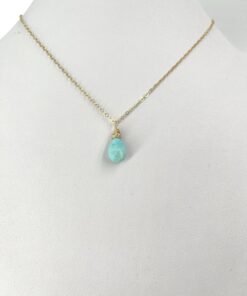 This Larimar pendant necklace features a natural pear‑shaped gemstone in a serene blue tone reminiscent of tropical waters. Available in 14K Gold Filled or Sterling Silver, it adds a calming, minimalist touch to everyday style.