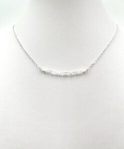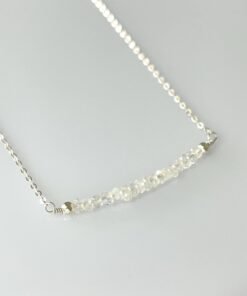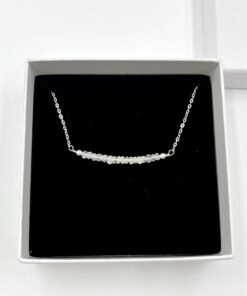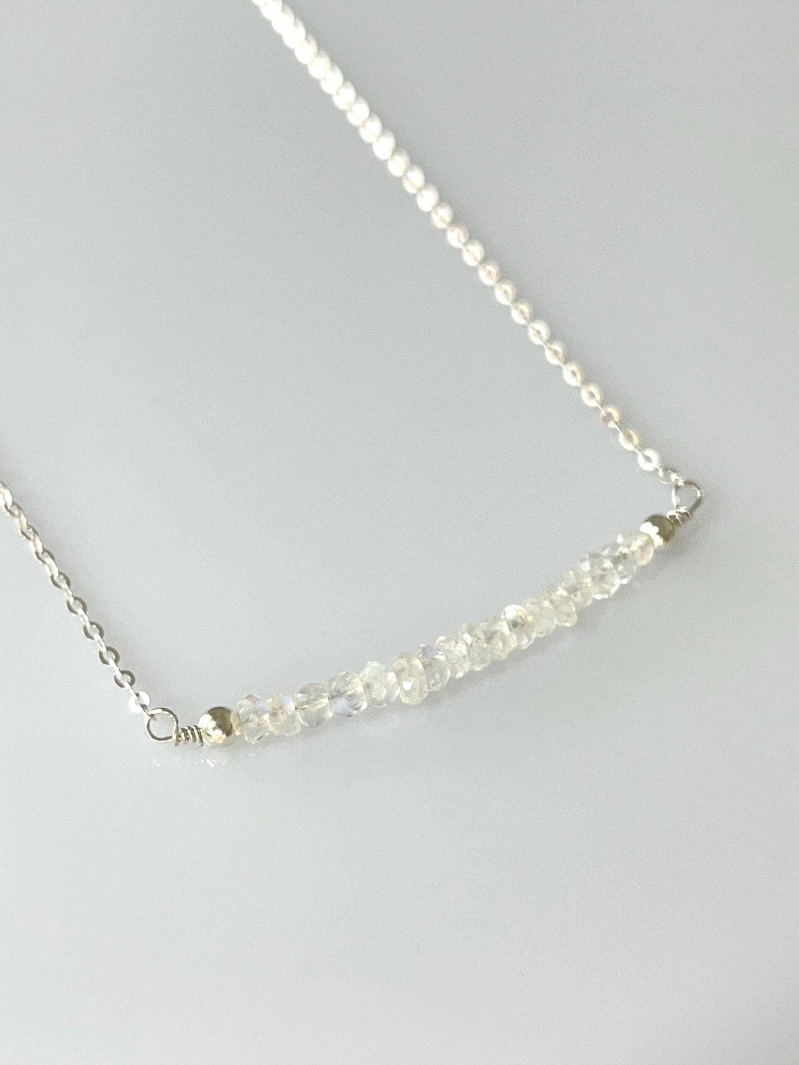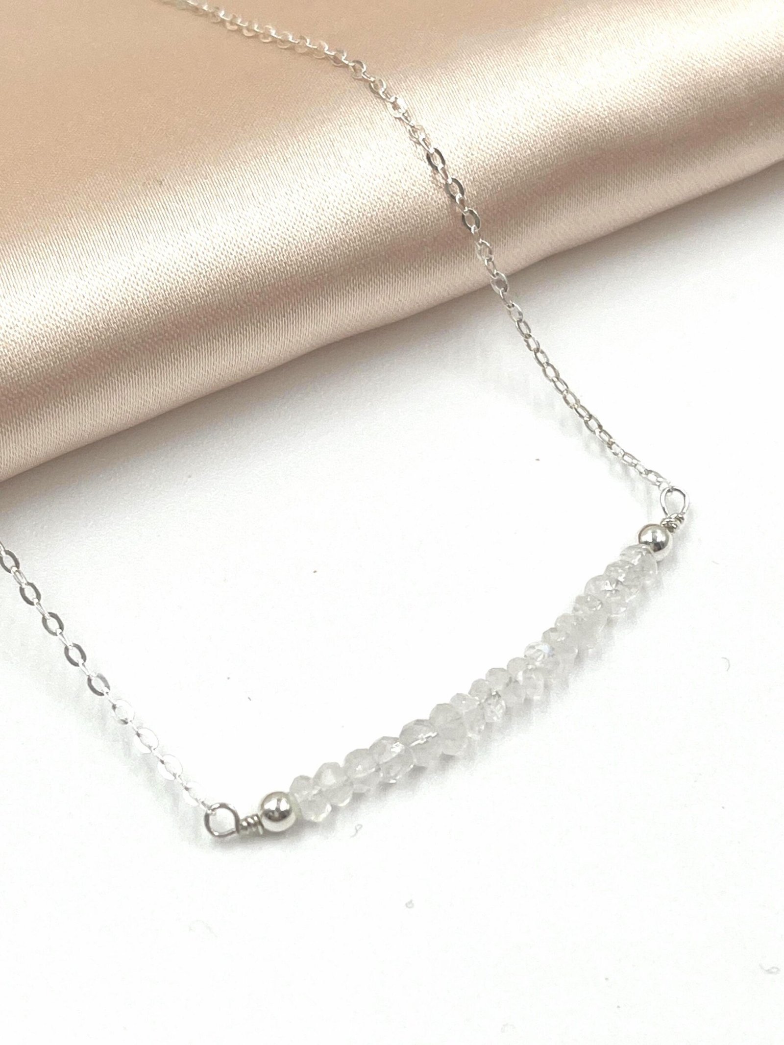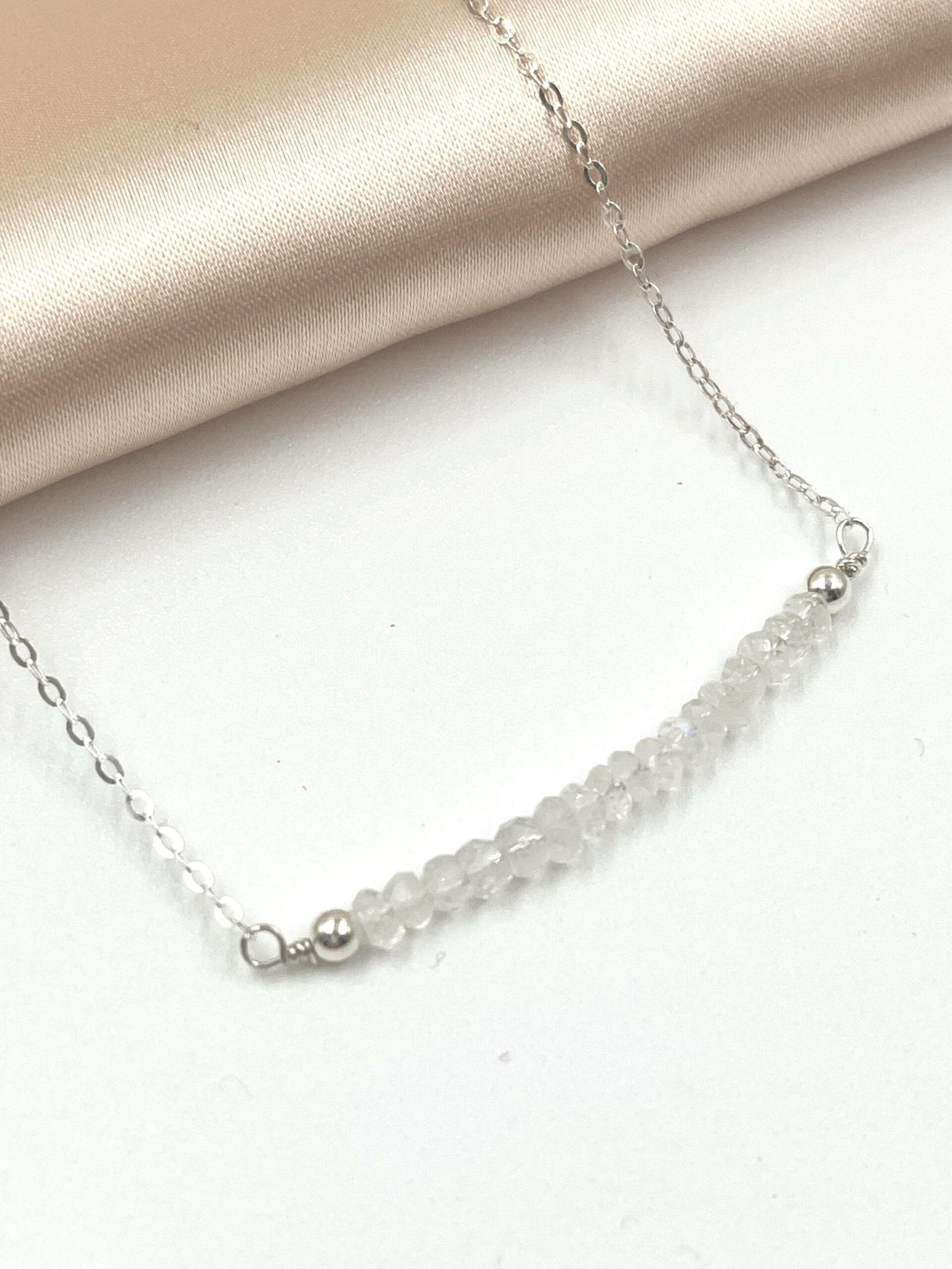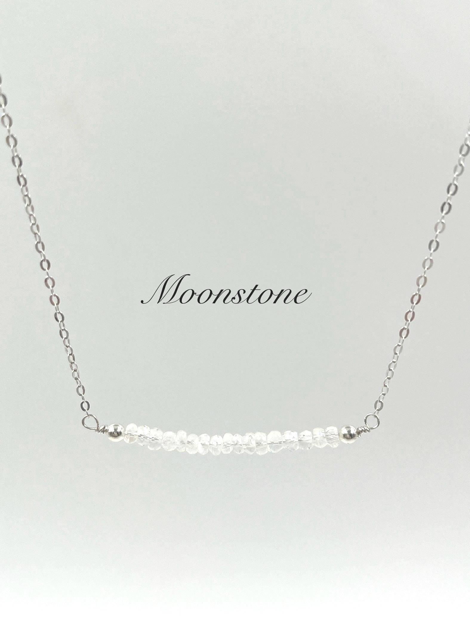 This Moonstone bar necklace features natural 3mm beads hand‑strung on a sleek, minimalist bar. Available in 14K Gold Filled or Sterling Silver, it adds a subtle, luminous touch to your everyday style.