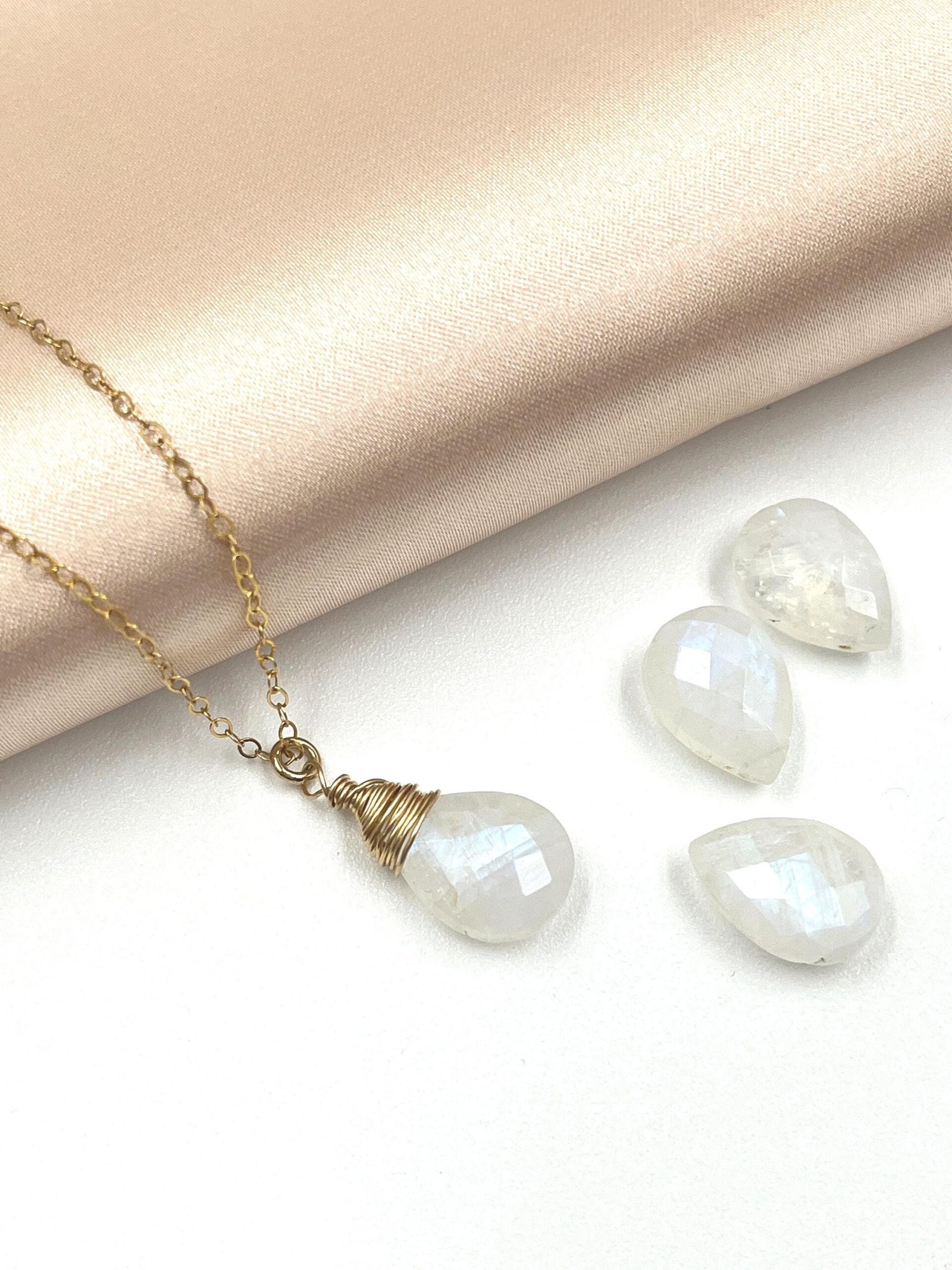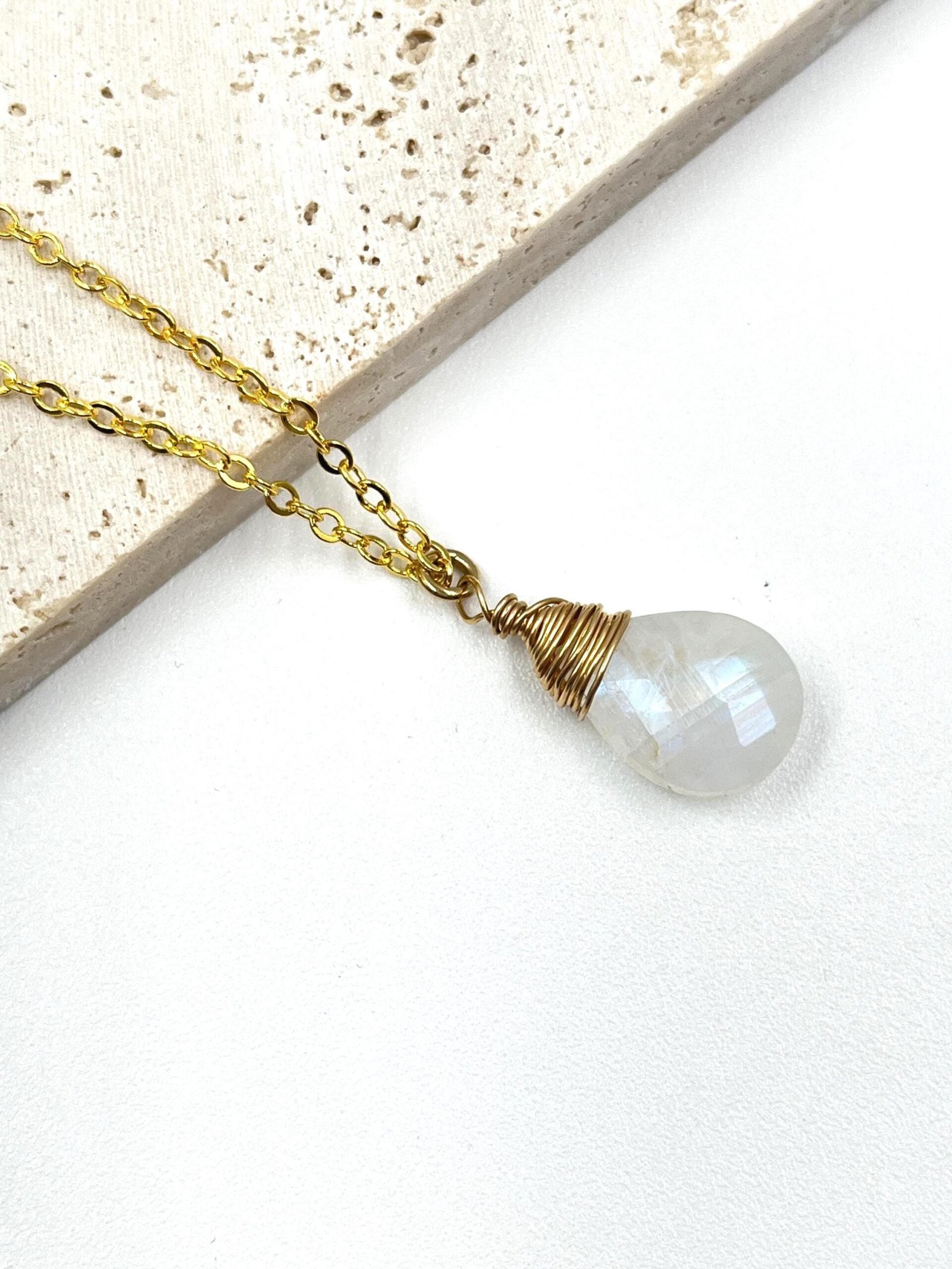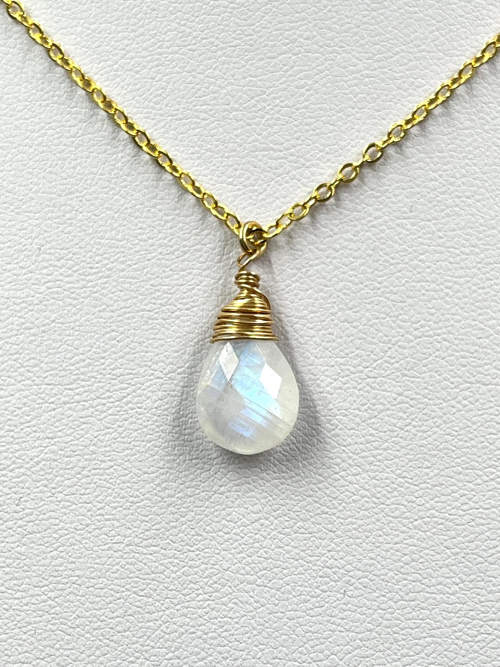 This handcrafted Moonstone necklace features a natural briolette gemstone with a beautiful blue flash. Available in 14K Gold Filled, 18K Gold Filled, or Sterling Silver, it brings a soft, luminous glow to your everyday style.