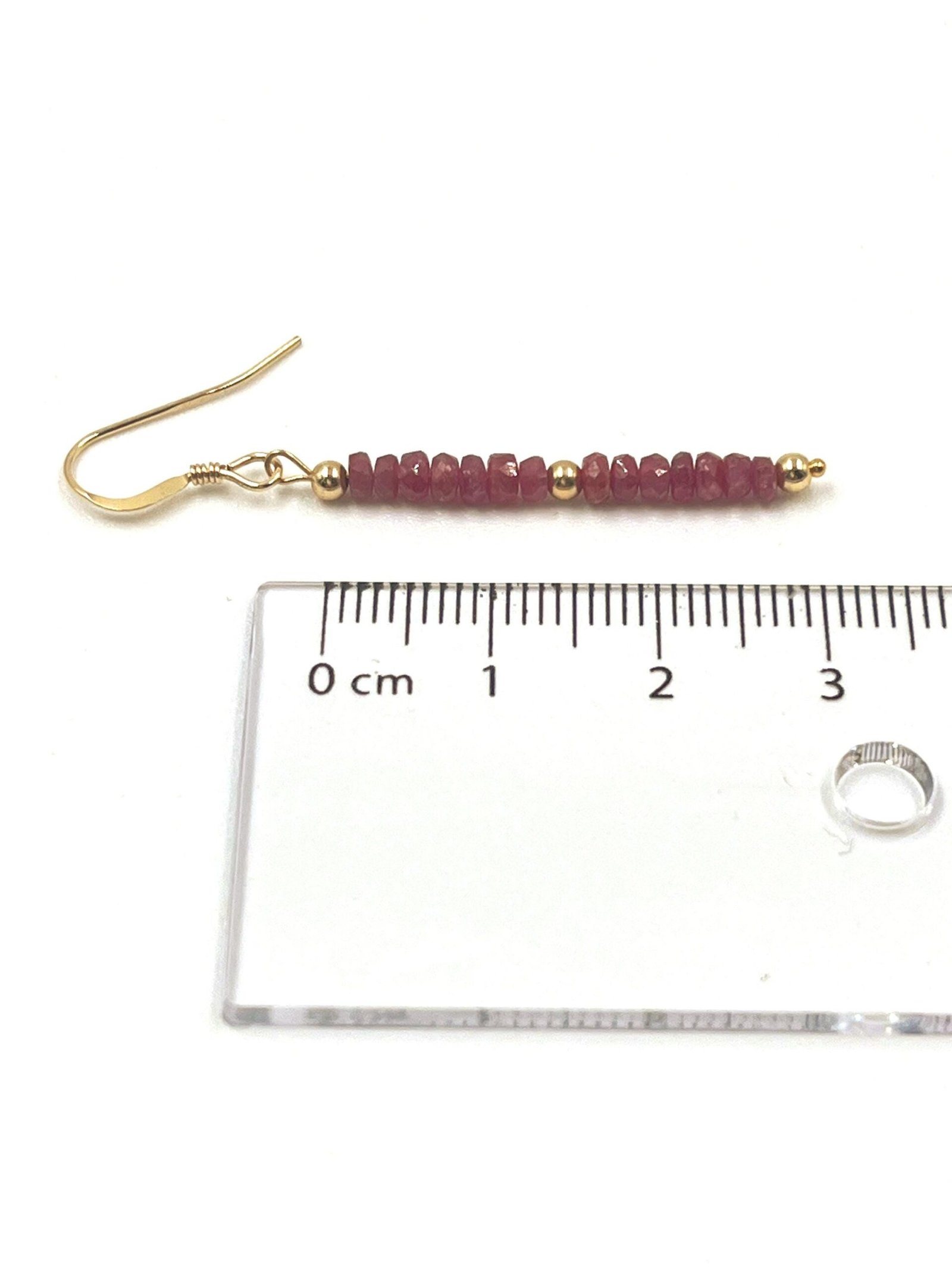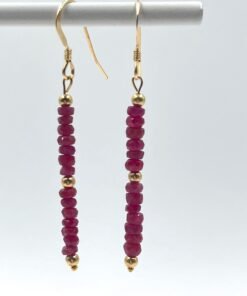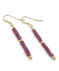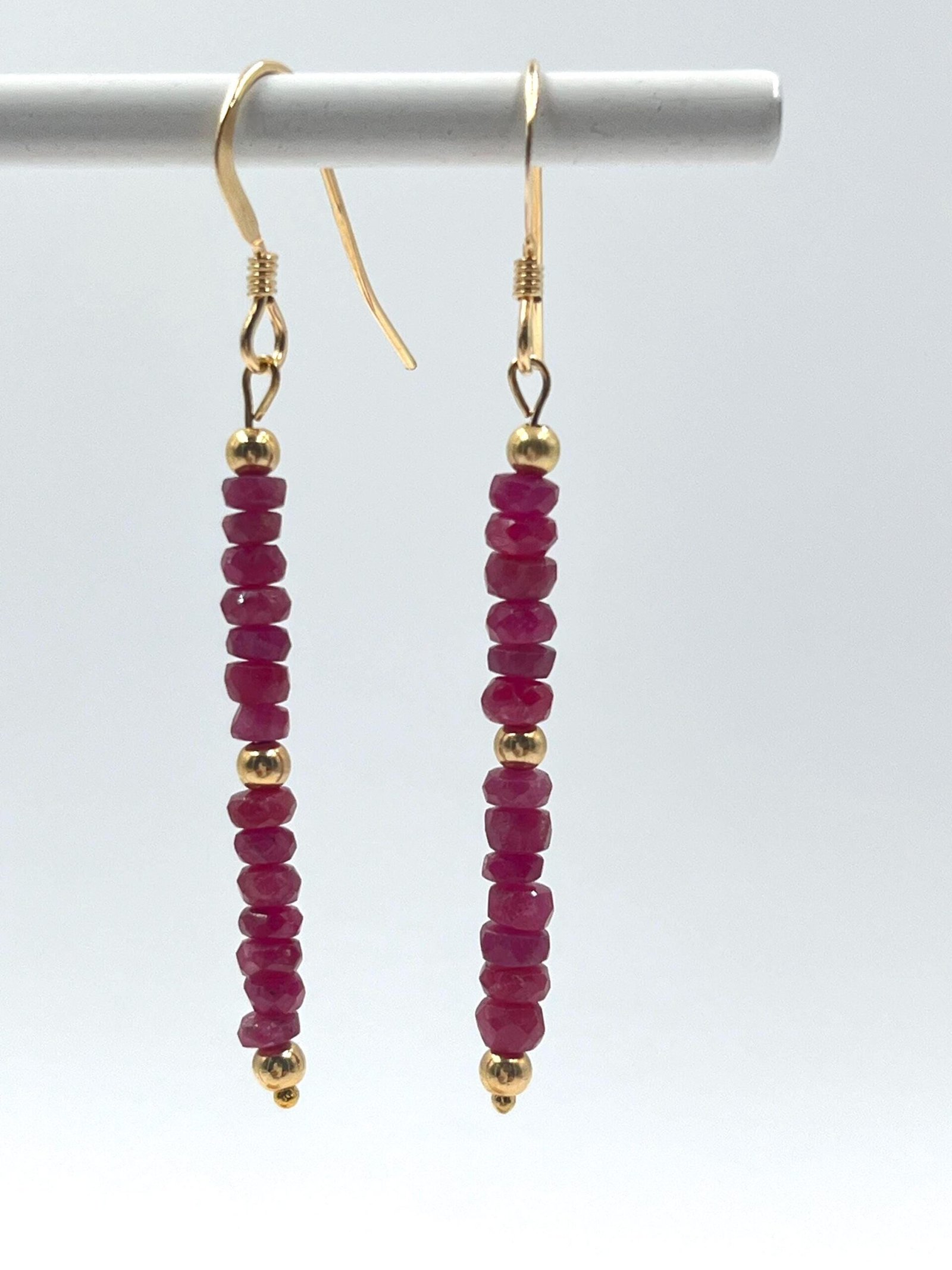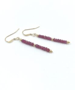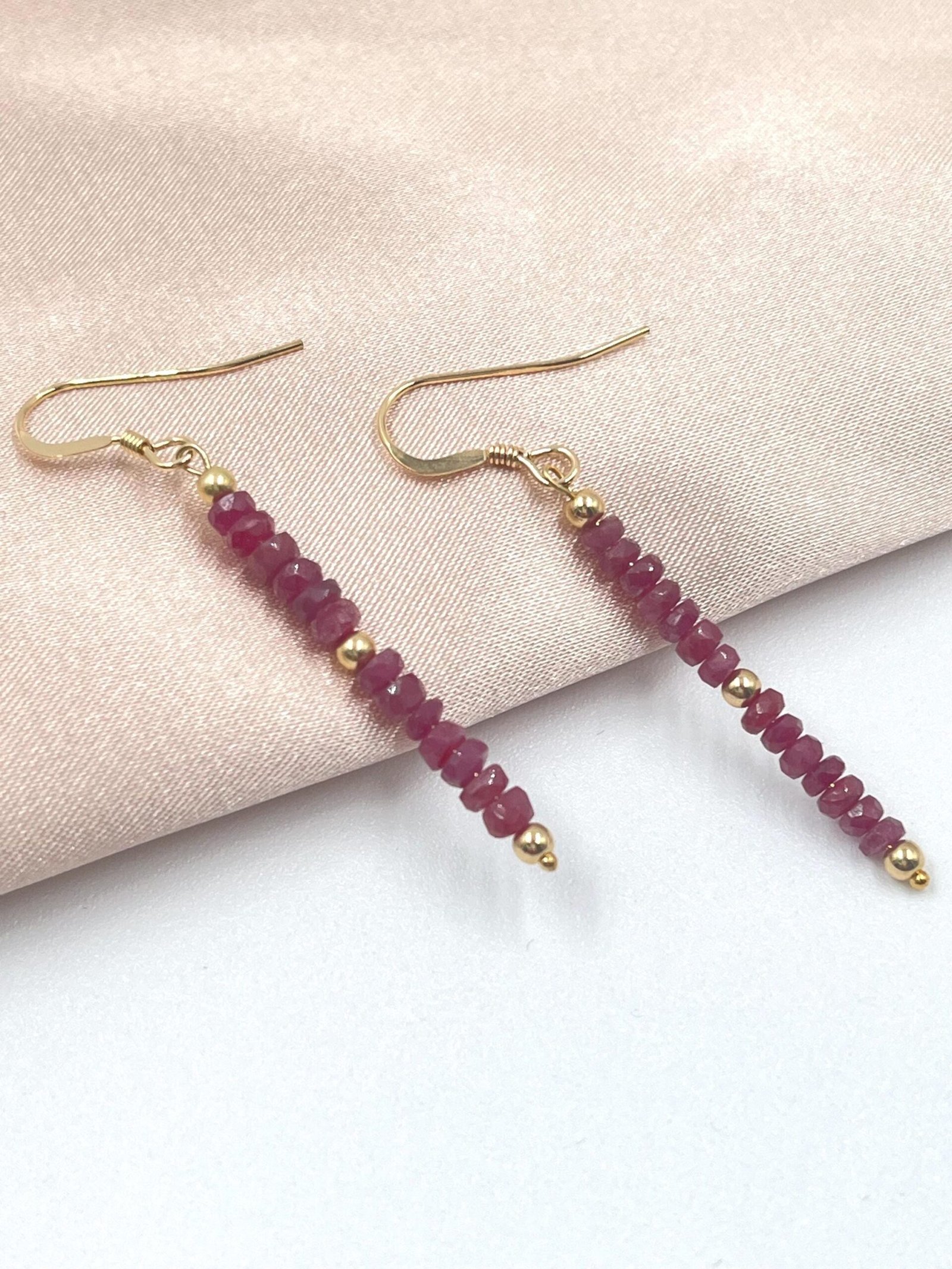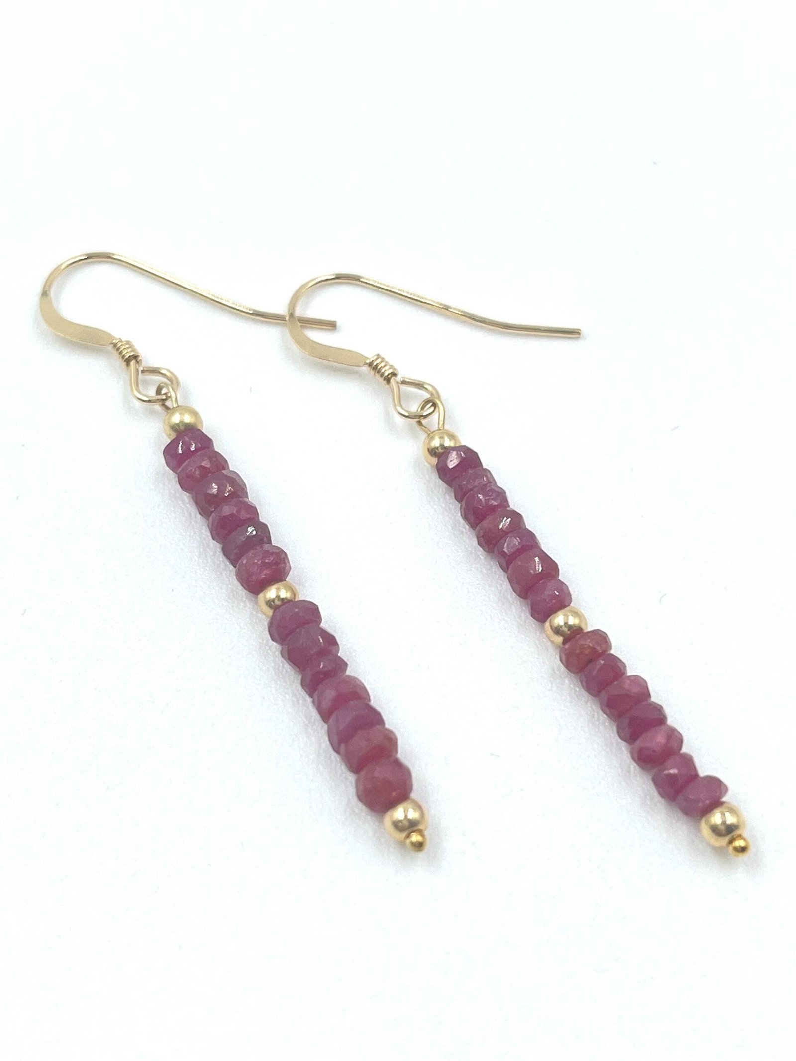 These handcrafted Ruby earrings feature natural faceted Ruby beads arranged in a delicate drop design. Available in Gold Filled or Sterling Silver, they add a bold, refined touch of red to any outfit.
